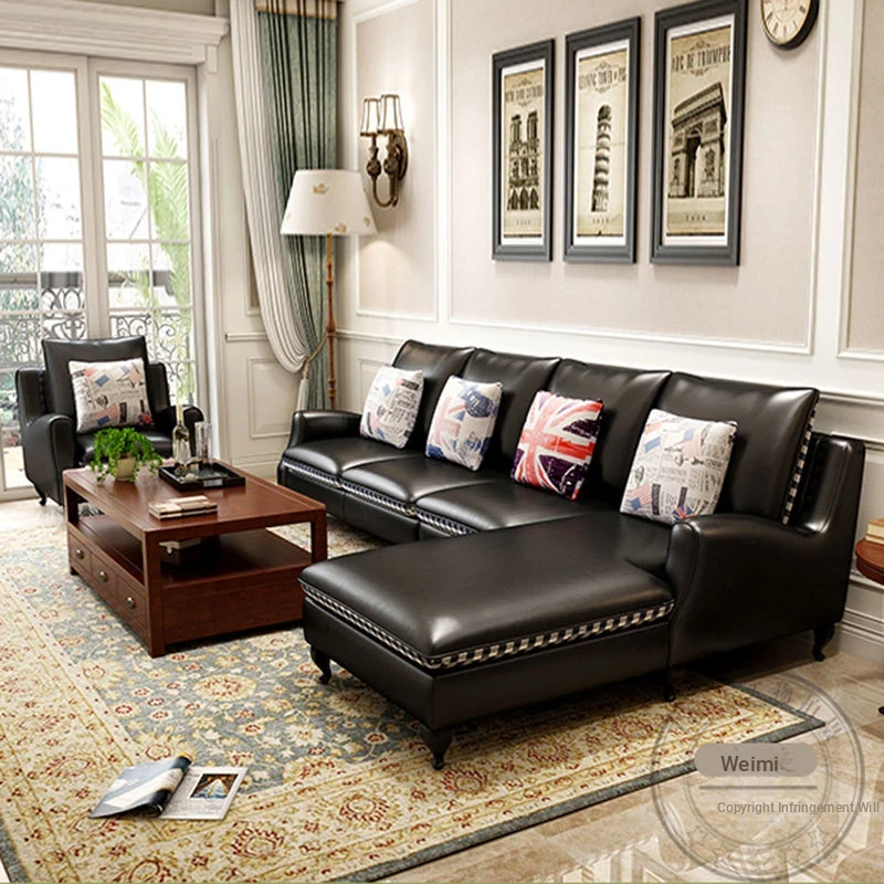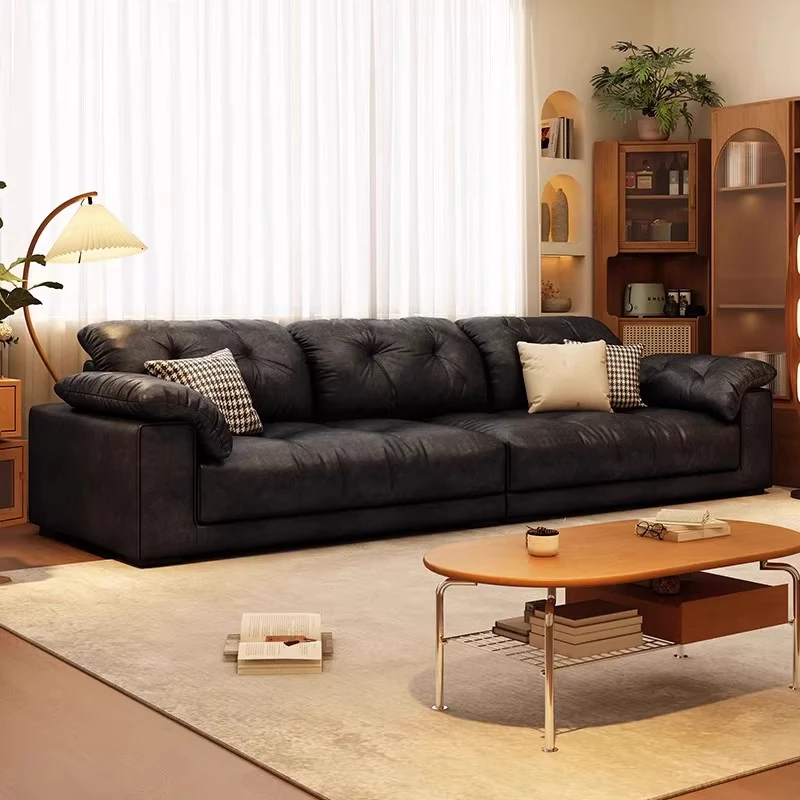 American Light Luxury Sofa - Vintage Black Straight Sofa for Living Room, French Retro Style Top-Grain Leather Sofa