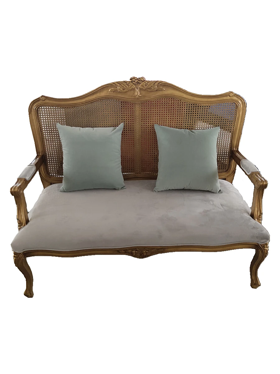 Nordic Vintage Solid Wood Woven Rattan Double Sofa - Antique Gold Finish for Small American Style Living Room, Ideal for Boutique Hotels and Photography Studios