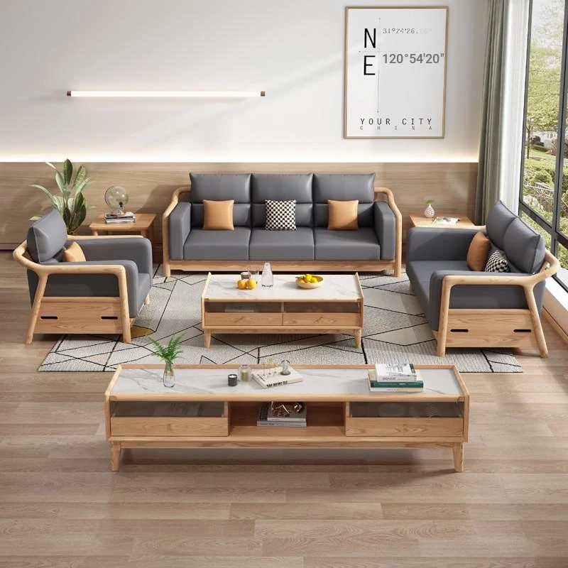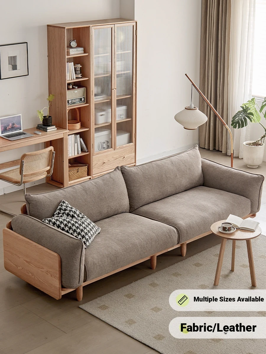Modern Minimalist Solid Wood Sofa with Genuine Leather - Scandinavian Style Oak Sofa for Living Room, Featuring Elegant Straight Design and Natural Wood Finish. Perfect for Home Decor!