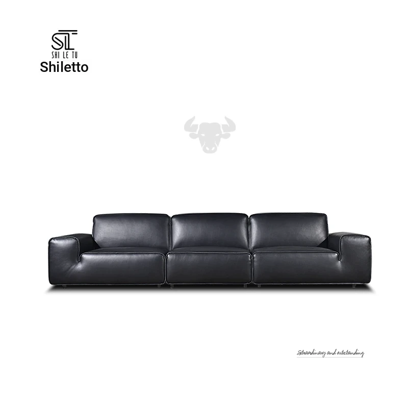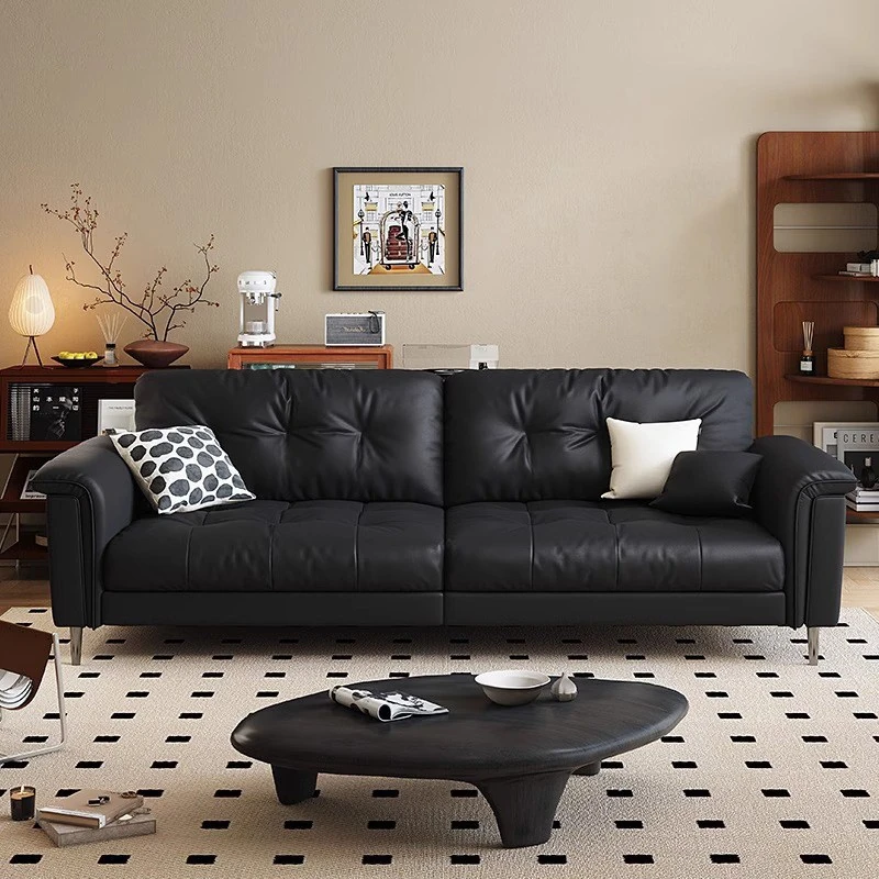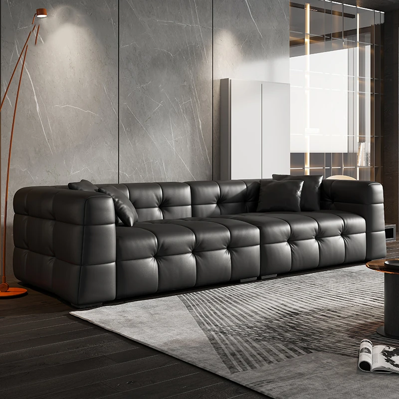 2025 New Italian Minimalist Full Leather Sofa - Black Tofu-Block Cotton Candy Sofa for Small Living Rooms in Foshan