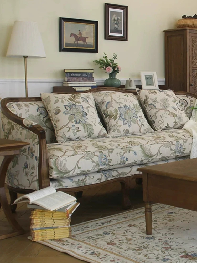 French Vintage Solid Wood Fabric Sofa - Luxury Villa Living Room Jacquard Leisure Chair - American Light Luxury Straight Three-Seater Couch for Elegant Interiors