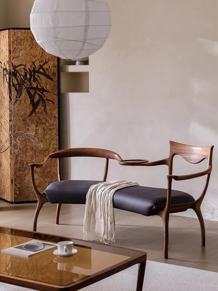 Mid-Century Modern Solid Black Walnut Double Sofa for Living Room - Italian Creative Loveseat with Continuous Design, Perfect for Cozy Spaces