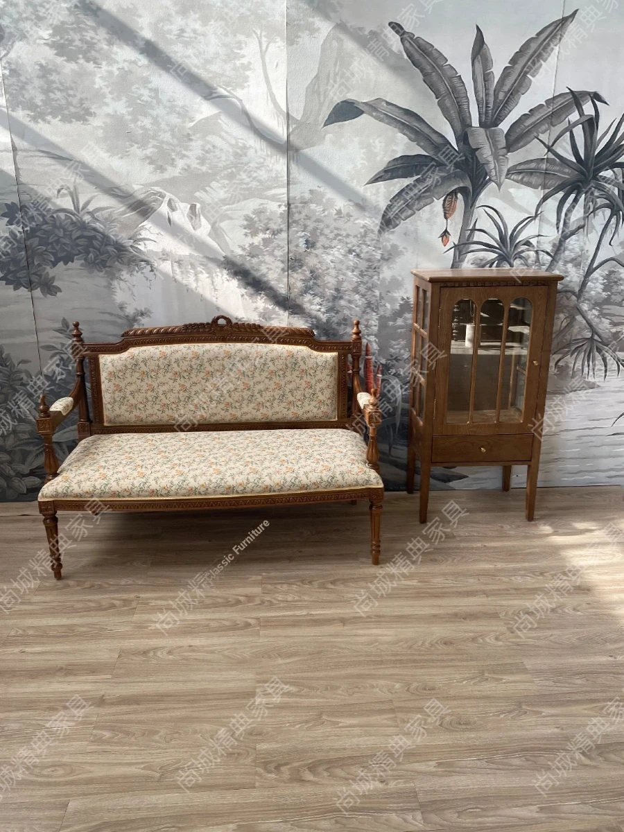 French Neoclassical Solid Wood Carved Sofa - Vintage Fabric Couch for Small Spaces, Retro Nanyang Style Loveseat for Home Use