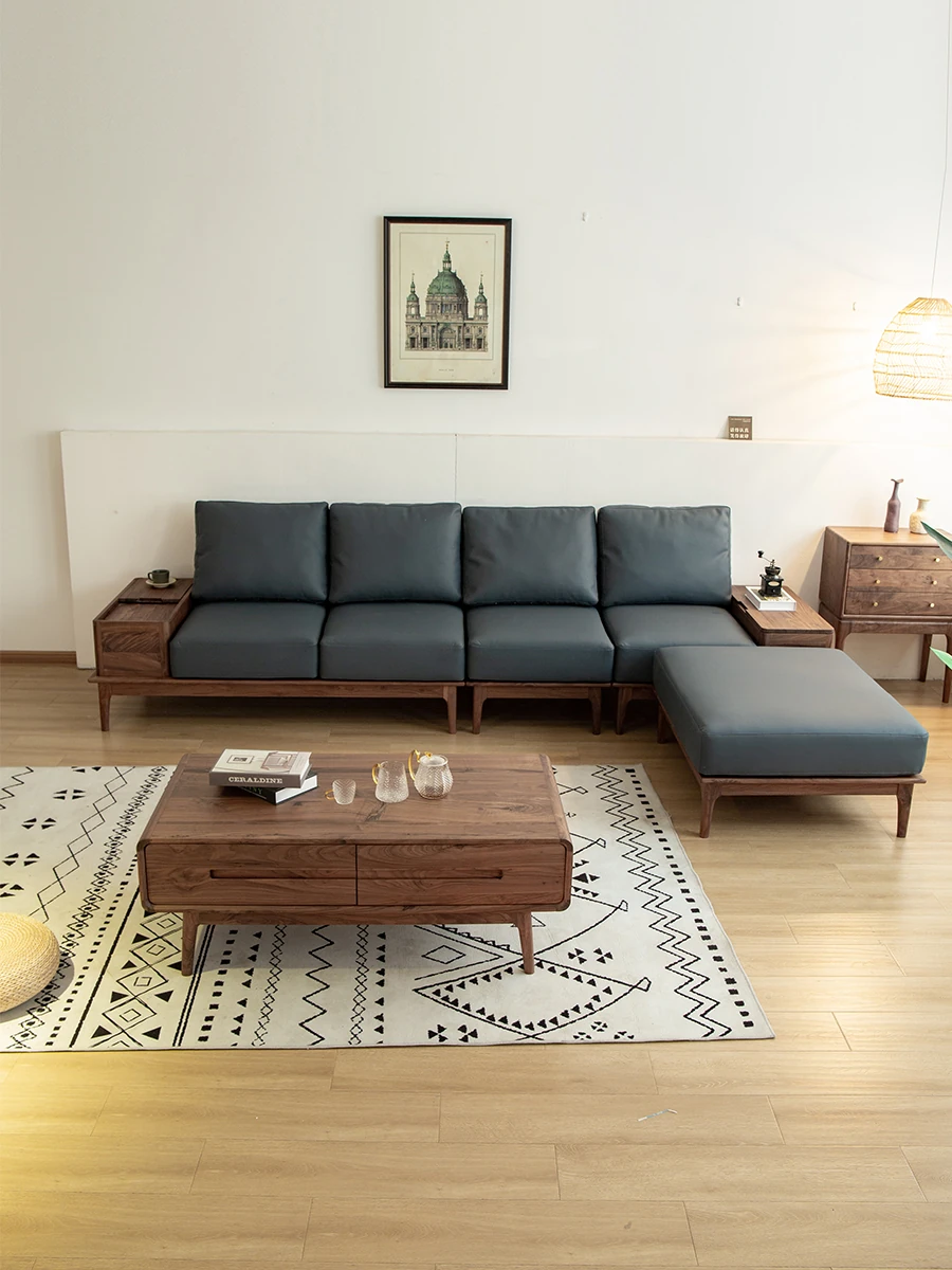 Modern Minimalist Solid Wood North American Walnut Sofa Set with Corner Chaise Lounge, Genuine Leather and Down Cushions - Perfect for Your Contemporary Living Room!