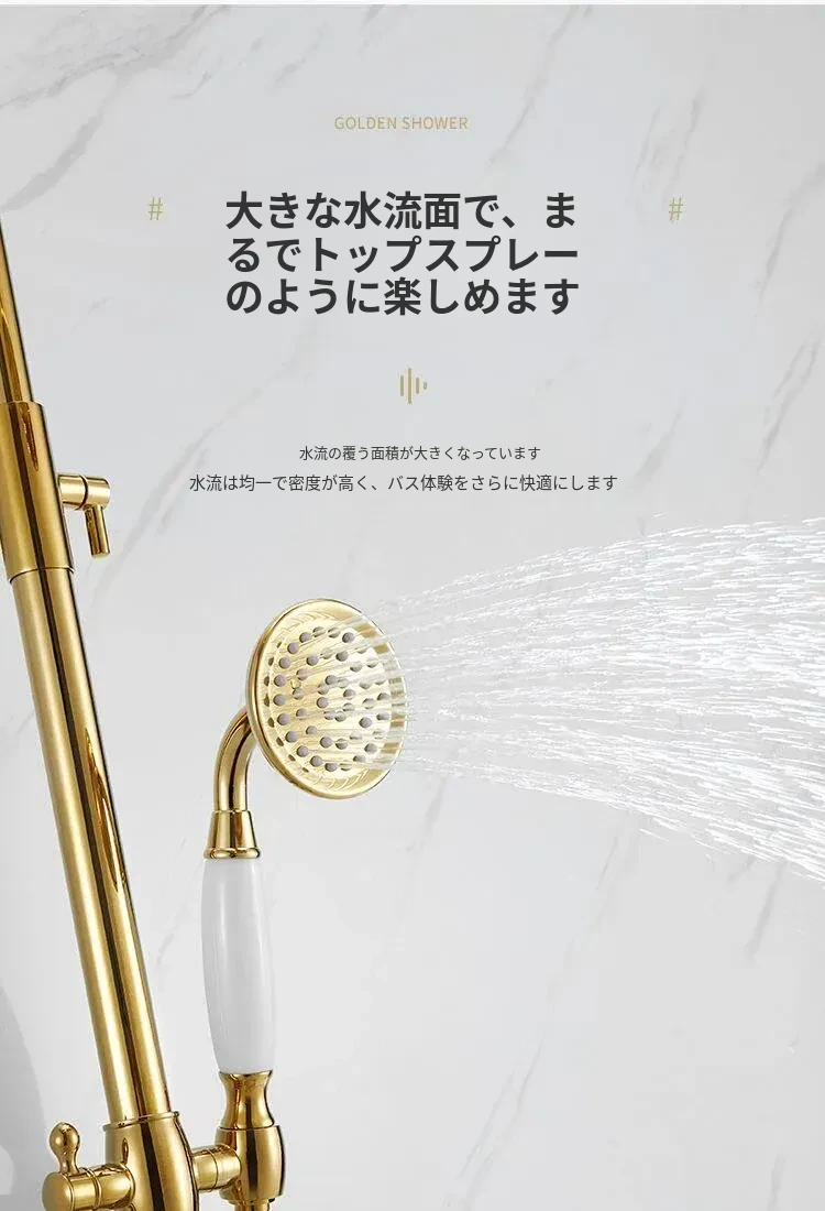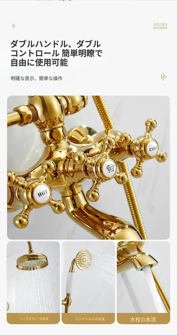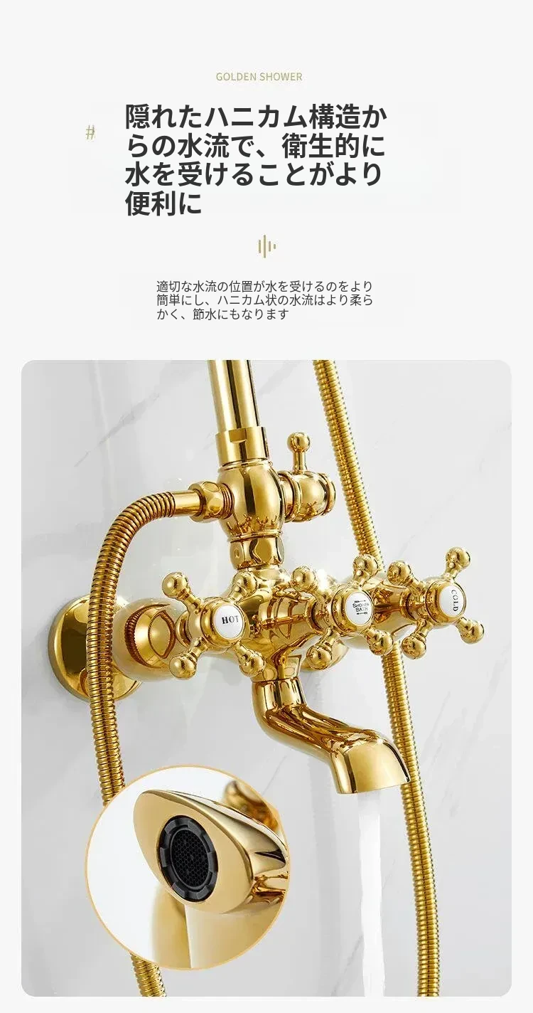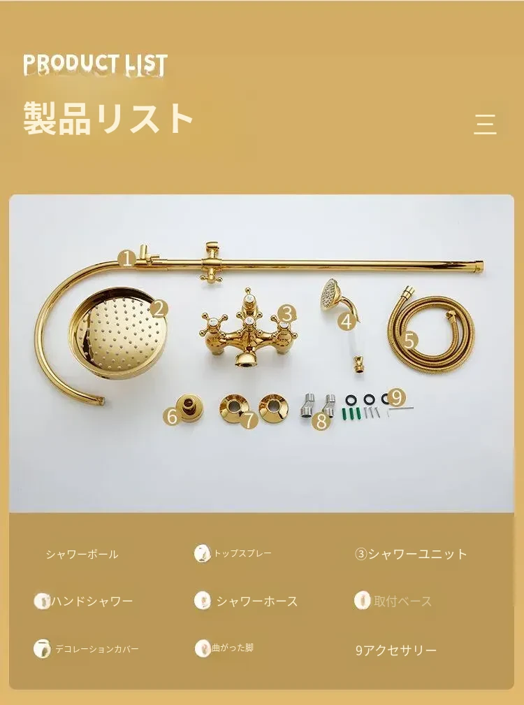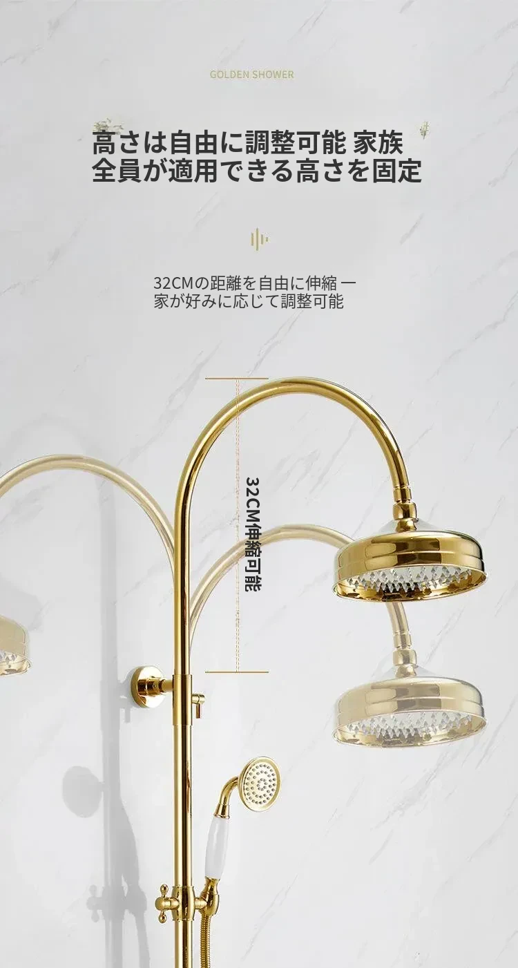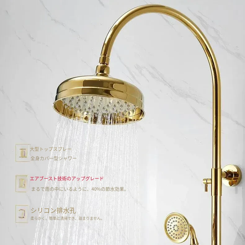 ヨーロッパ風ゴールドシャワーセット|全銅製・増圧機能付き・レトロなデザイン|おしゃれなバスルームを演出します!
