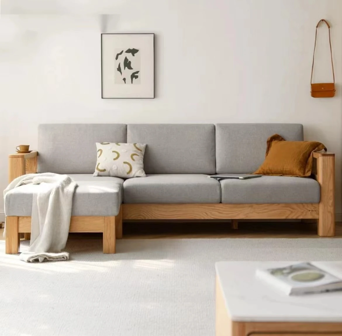 工場直販!北欧スタイルの無垢オークウッドソファセット - モダンでシンプル、小型リビングに最適なデザイン。快適なくつろぎ空間をお届けします!